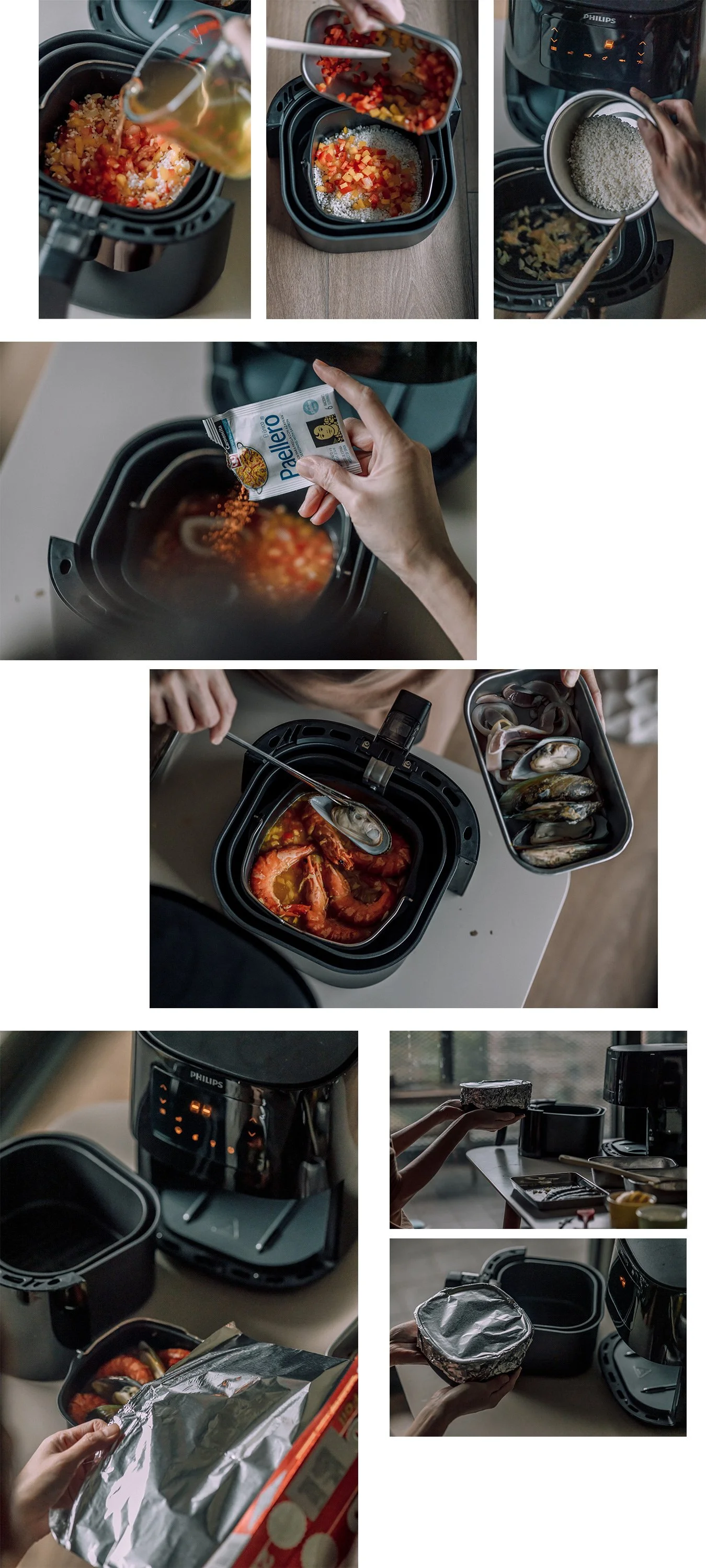 氣炸鍋使整個燉飯散發出誘人的香氣。這道燉飯的一打開就能感覺到香氣四溢,因為有各種不同的海鮮和米飯,以及專用香料粉的混合,味道豐富吃的時候可感到層次感豐富。