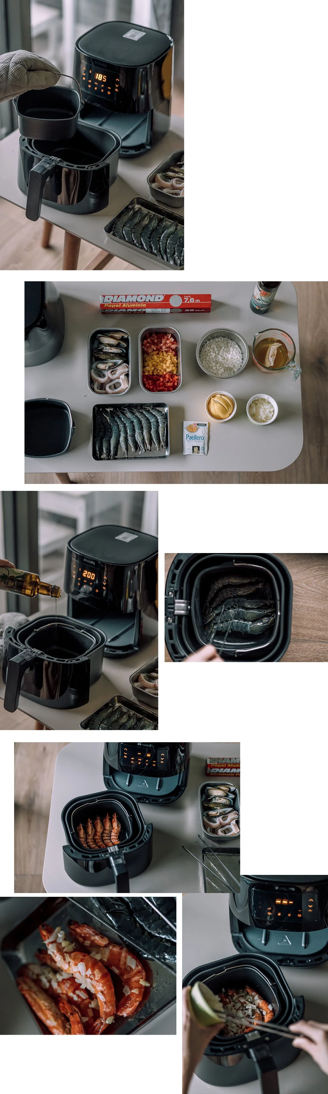 這邊唯一要注意是先讓將蝦子、洋蔥放進烘烤鍋氣炸2-3分鐘,讓香氣先出來,再把其他食材一起放入調理!