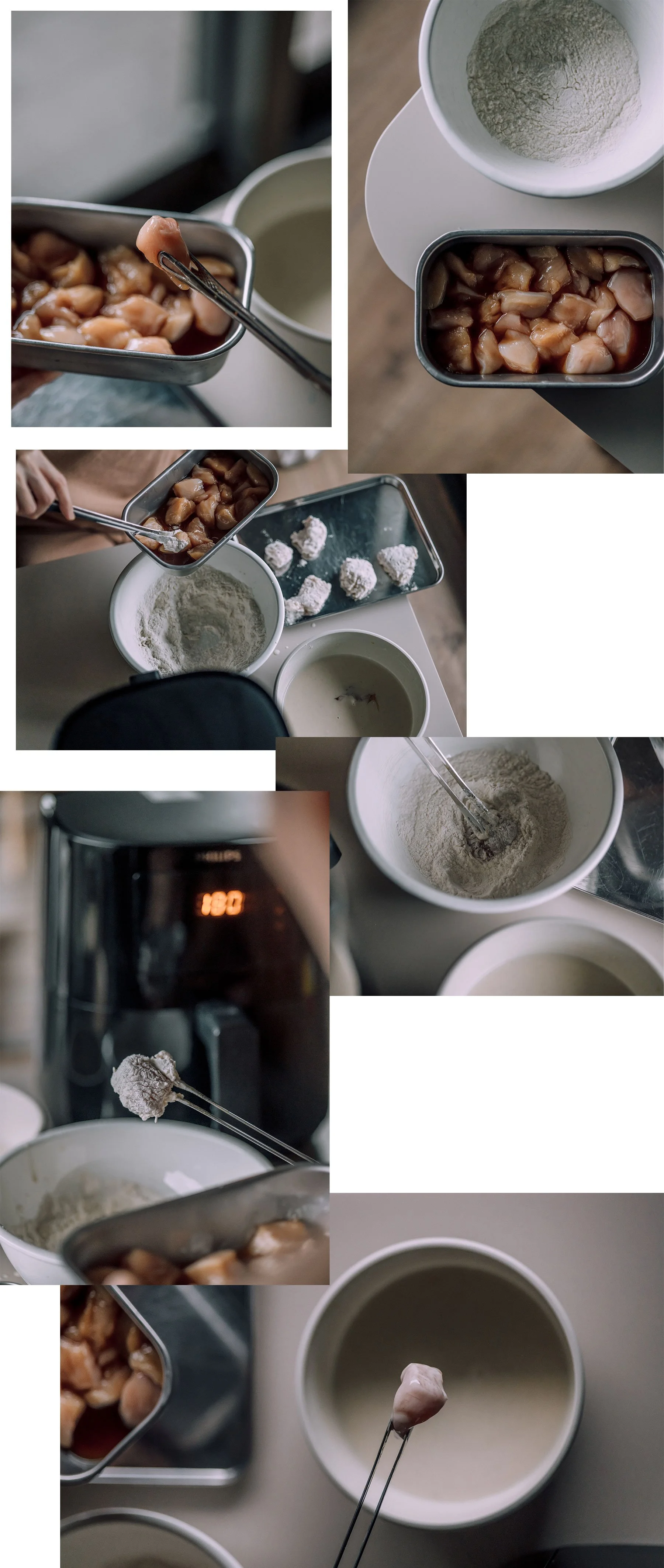 這次的唐揚炸雞我們試了兩種,一種是上面提供的做法,另一種是先裹漿(水+粉)再沾粉 (下面的圖片有註明) ,如果以正確的說法及好吃程度,是不需要裹漿!